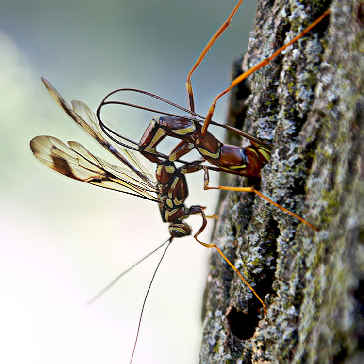 Ichneumon Wasp laying eggs in old tree
