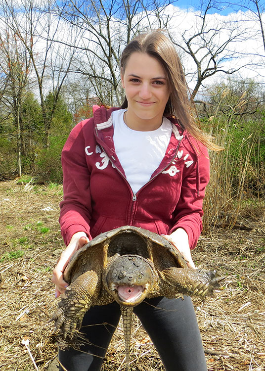 Stephanie Silva with Snapping Turtle at Forge Pond